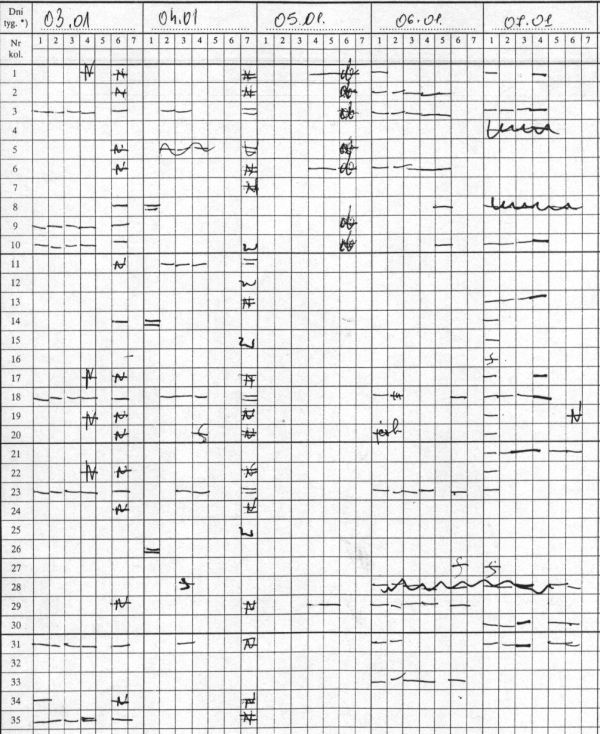 zaznaczonymi nieobecnościami. Podłużne kreski oznaczają nieobecność. Kreski przekreślone " wężykiem" oznaczają, że